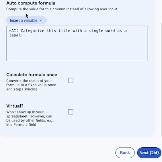 Ты создаёшь колонку, пишешь формулу типа =AI(...), задаёшь промпт вроде: “Категоризируй этот тайтл одним словом”, подставляешь название товара, жмёшь Generate and insert.