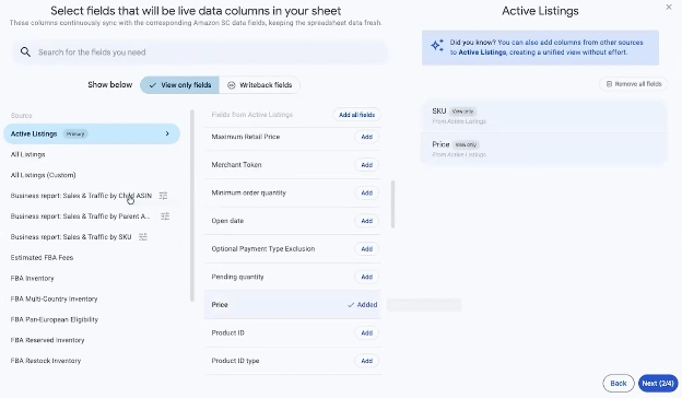 Например, Active Listings. Дальше выбираешь атрибуты, которые станут колонками: SKU, Price и так далее.