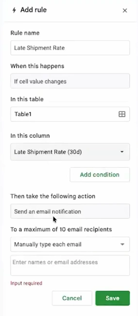 Выделяешь столбец, идёшь в Tools → Conditional Notifications, добавляешь правило, задаёшь условие, указываешь email.