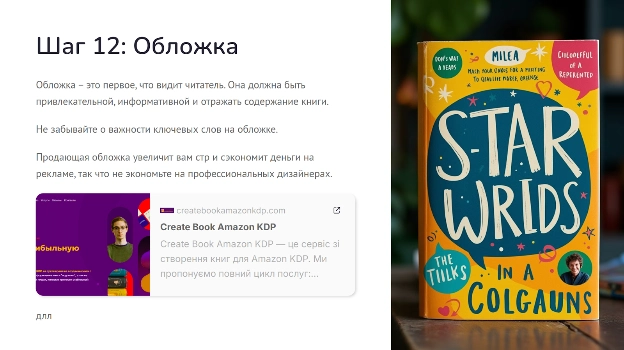 Обложка. Она работает как переплёт в офлайне. Впечатляющая обложка привлекает внимание и заставляет кликнуть. Если дизайн слабый, CTR и продажи будут падать.