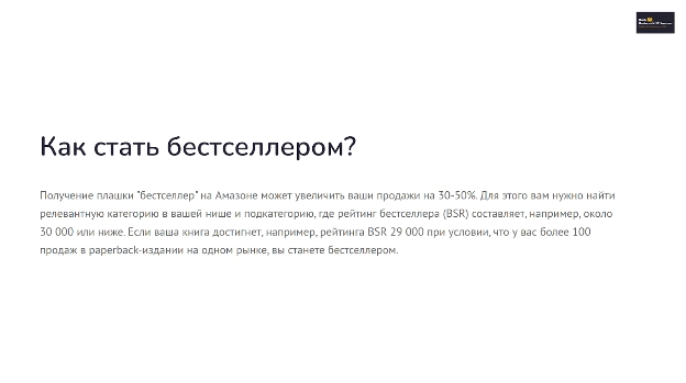 Например, если твоя книга выйдет на BSR 29 000 при условии, что у тебя более 100 продаж в paperback-формате на одном рынке, ты получишь плашку «Бестселлер».