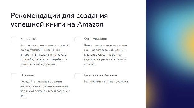Вова: Даша, можно в одном блоке собрать главные факторы успеха книги на Amazon?
