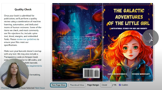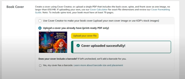 Даша: Далее мы загружаем обложку. Здесь можно выбрать: либо загрузить свой готовый файл (тоже в PDF), либо воспользоваться встроенным инструментом Amazon — Cover Creator.