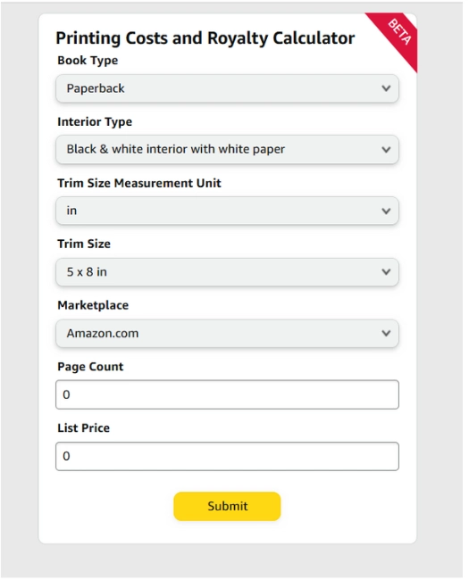 Это официальный калькулятор на Амазоне, и в нём можно выбрать тип книги, формат, цену, а система автоматически посчитает твои роялти с учётом печати и всех условий.